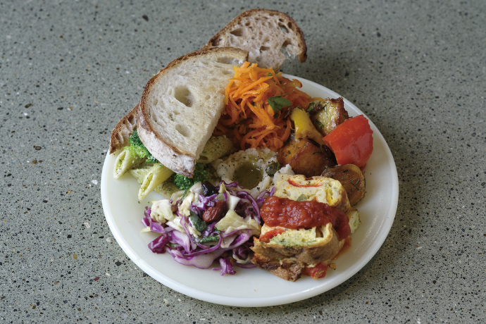季節の野菜やハーブを使った、日替わりデリ 5 種の盛り合わせ。中央のディップソースを付けたり、パラダイスアレイのパンと合わせたり、お酒のお供にしたりと、自由なスタイルでお楽しみください。