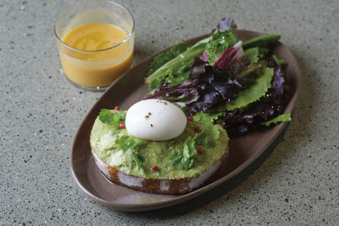 アボカドをオリーブオイルとレモン果汁でシンプルに味付けし、半熟卵、パクチー、レッドペッパーを添えたオープンサンド。フレッシュサラダと季節のスープが付いた満足感ある一皿です。